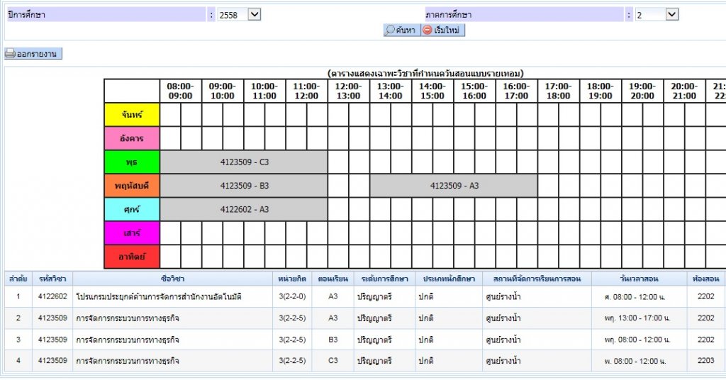 รหัส 56 รายวิชา 4122602 โปรแกรมประยุกต์ด้านการจัดการสำนักง่านอัตโนมัติ จำนวน 3 (2-2-5) หน่วยกิต ตอนเรียน A3 จำนวนผู้สอน 1 คน