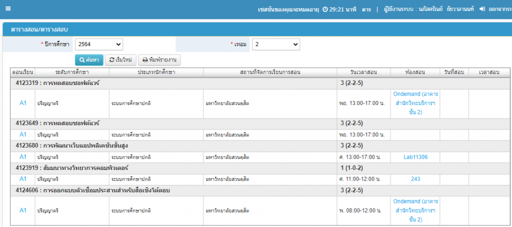 2. รหัส 4123649 รายวิชา การทดสอบซอฟต์แวร์ หน่วยกิต 3(2-2-5) คิดเป็น 9 ชั่วโมงต่อสัปดาห์ ตอนเรียน A1 จำนวนผู้สอน 1 คน