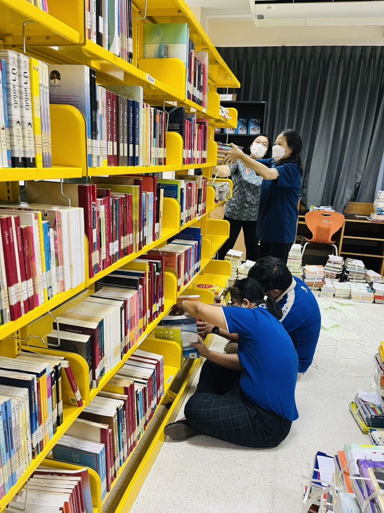 - งานการจัดเรียงหนังสือที่ผู้ใช้บริการนำส่งคืน / หนังสือมาใหม่เข้าห้องผลงานวิชาการ